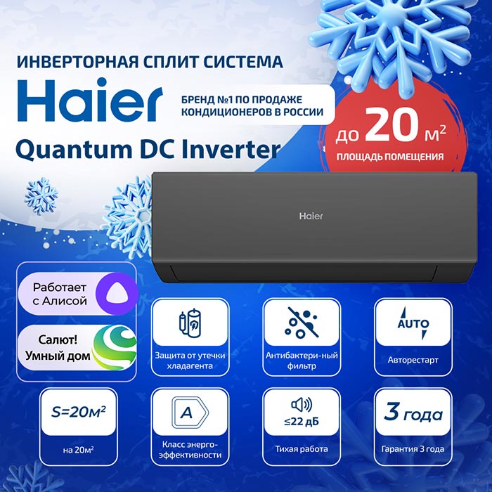 Сплит система Haier AS20HQJ1HRA-B/ 1U20HQJ1FRA серии Quantum DC InverterОбслуживаемая площадь помещения 20 кв.м. Оборудование работает на охлаждение и обогрев при наружной температуре от -15 до +43С.Wi-Fi управление (evo)Удаленное управление системой с любой точки мира через мобильное приложение evo.Голосовой помощникГолосовое управление и подключение климатической техники к единой системе через приложение Умный дом.Уровень шума 22 дБ(А)Оборудование можно эксплуатировать в помещениях с повышенными требованиями к тишине, таких как спальни и детские комнаты.ФильтрацияУстановленный антибактериальный фильтр уничтожает бактерии, вирусы, аллергены и другие загрязнители.Режим TurboВентилятор блока работает на повышенных оборотах, что позволяет быстрее достичь требуемой температуры.Благодаря инверторному управлению кондиционеры быстро выходят на заданную температуру и плавно поддерживают ее. При этом расходы на электроэнергию минимальны. Особенности систем:- режим TURBO позволяет максимально быстро охладить или обогреть помещение- функция сонавторестарт.